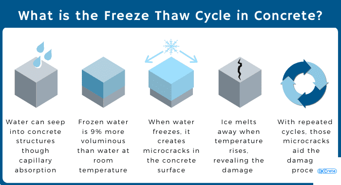 Concrete is only vulnerable if it freezes before it reaches initial strength. Once it cures past that stage, freezing temperatures alone won’t cause damage.